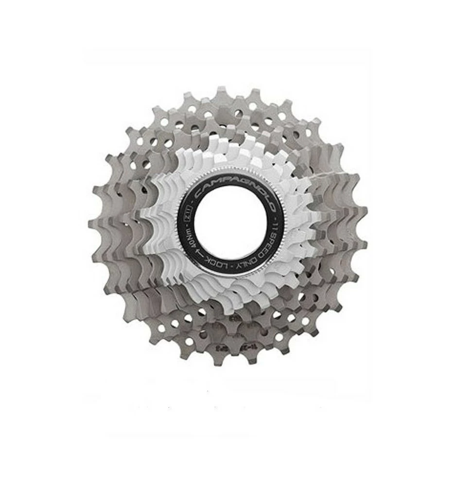 Campagnolo Super Record 11 vitesses cassette 12-27 dents. Cassette Campagnolo Record 11 speed composé de 5 pignons acier + 6 pignons Titane. Le supports porte-pignons campagnolo est en alliage léger pour les 2 derniers groupes de trois pignons.